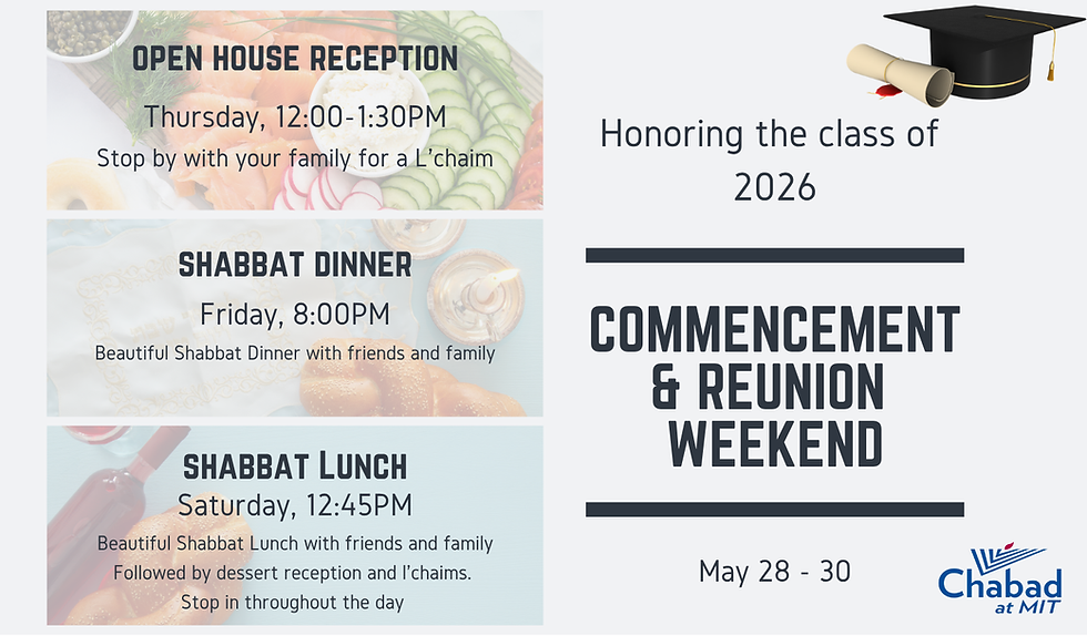 Welcome to Chabad at MIT – serving the Jewish undergraduate and graduate students. We invite you to explore our site and contact us if we can be of service to you. We look forward to personally welcoming you to the Chabad House. You will find good food, warmth, and a great time - at a home you can call your own!